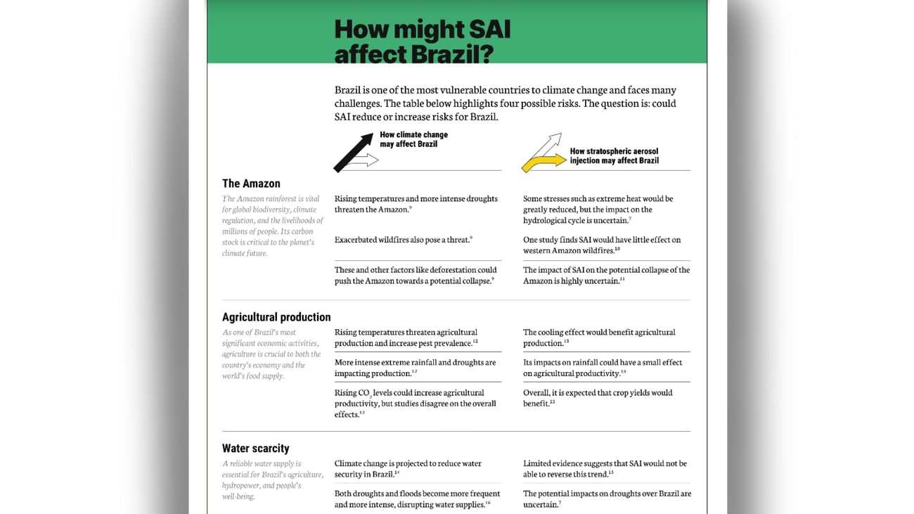 How could SRM influence Brazil’s climate risks? We collaborated with the Climate and Society Institute (iCS) to produce a primer that informed a national seminar with Brazilian experts, policymakers, and civil society leaders, discussing SRM science, governance, and ethics. |